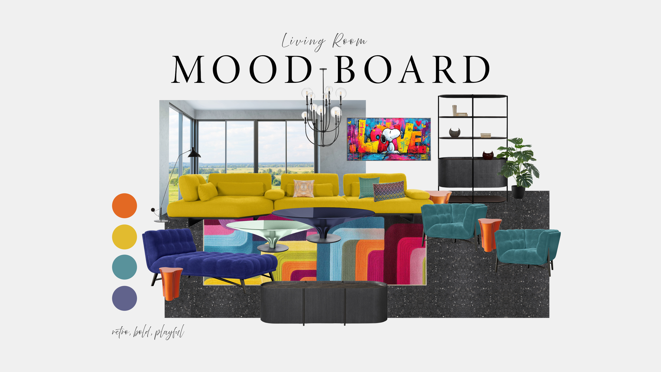 This modern living room began as a study in restraint—dark concrete floors, concrete-toned walls, and uninterrupted architectural lines defining a minimalist envelope. The client envisioned a living room that felt retro, bold, and playfully sophisticated—a space where expressive color and sculptural design could take center stage against a restrained architectural backdrop. Graphic pattern, saturated upholstery, and high-gloss accents will animate the gallery-like shell, transforming the open volume into a playful yet curated environment. The result is a dynamic interplay between architecture and artistry—where panoramic views remain the backdrop, and expressive mid-century silhouettes, chromatic contrast, and luminous detailing bring a spirited sophistication to the space.